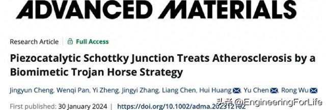 近日,来自上海交通大学的吴蓉和上海大学的陈雨、Hui Huang教授团队进行了压电催化肖特基结通过仿生特洛伊木马策略疗养动脉粥样硬化的相关研究。研究成果以“Piezocatalytic Schottky Junction Treats Atherosclerosis by a Biomimetic Trojan Horse Strategy”为题于01月30日发表在《Advanced Materials》上。