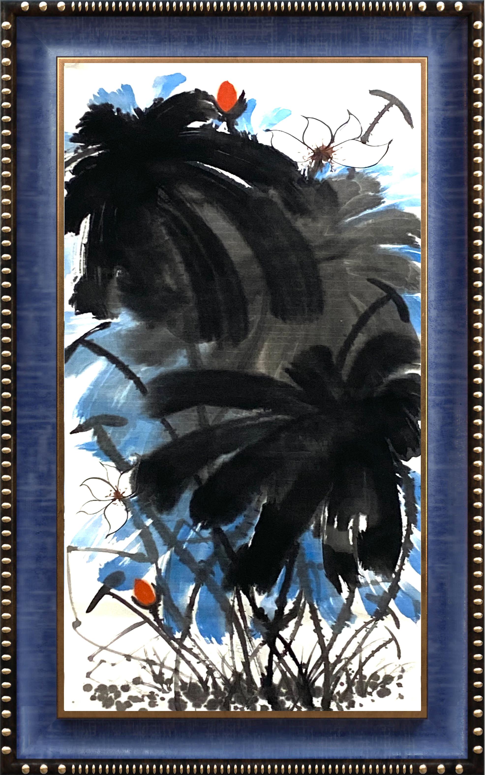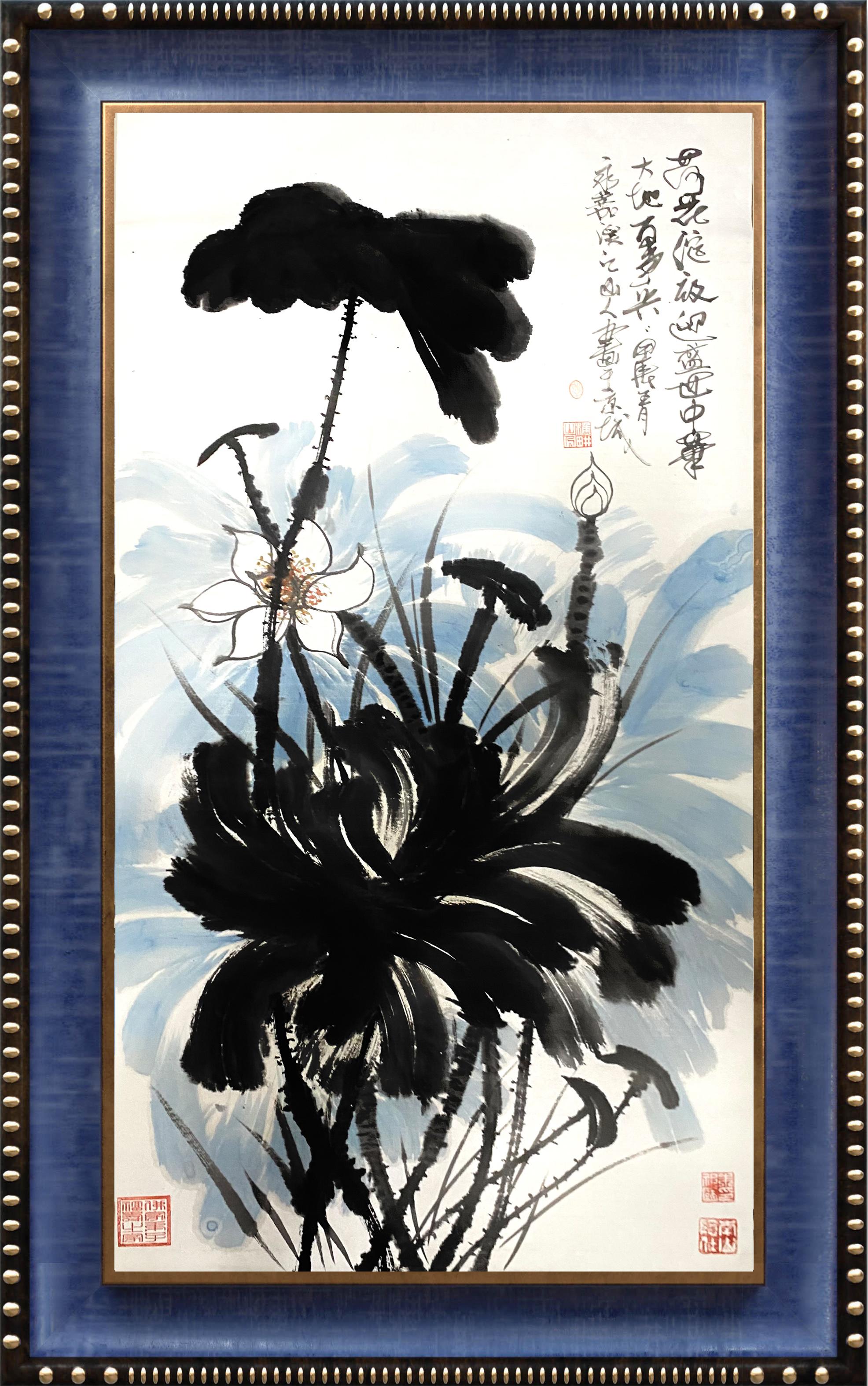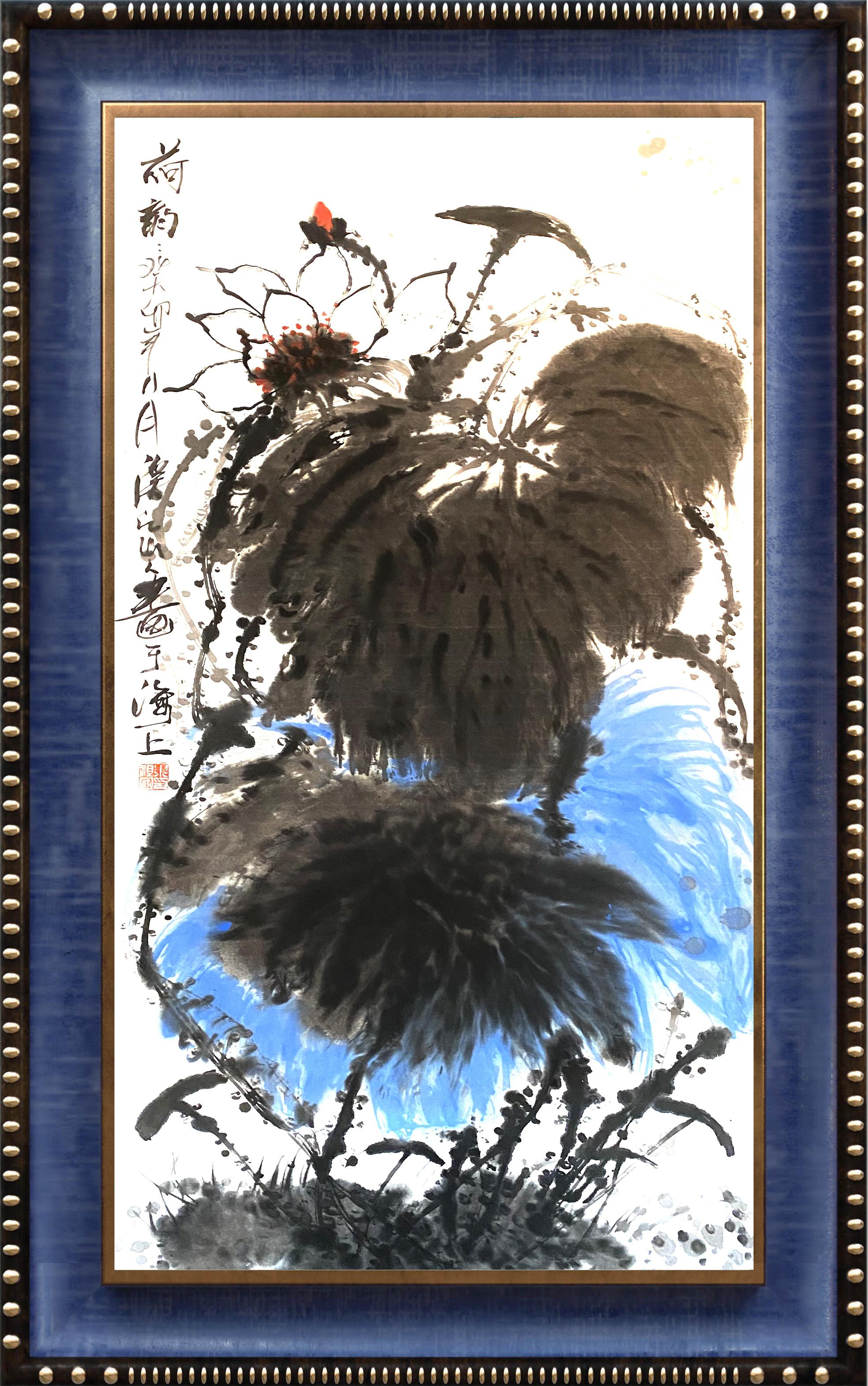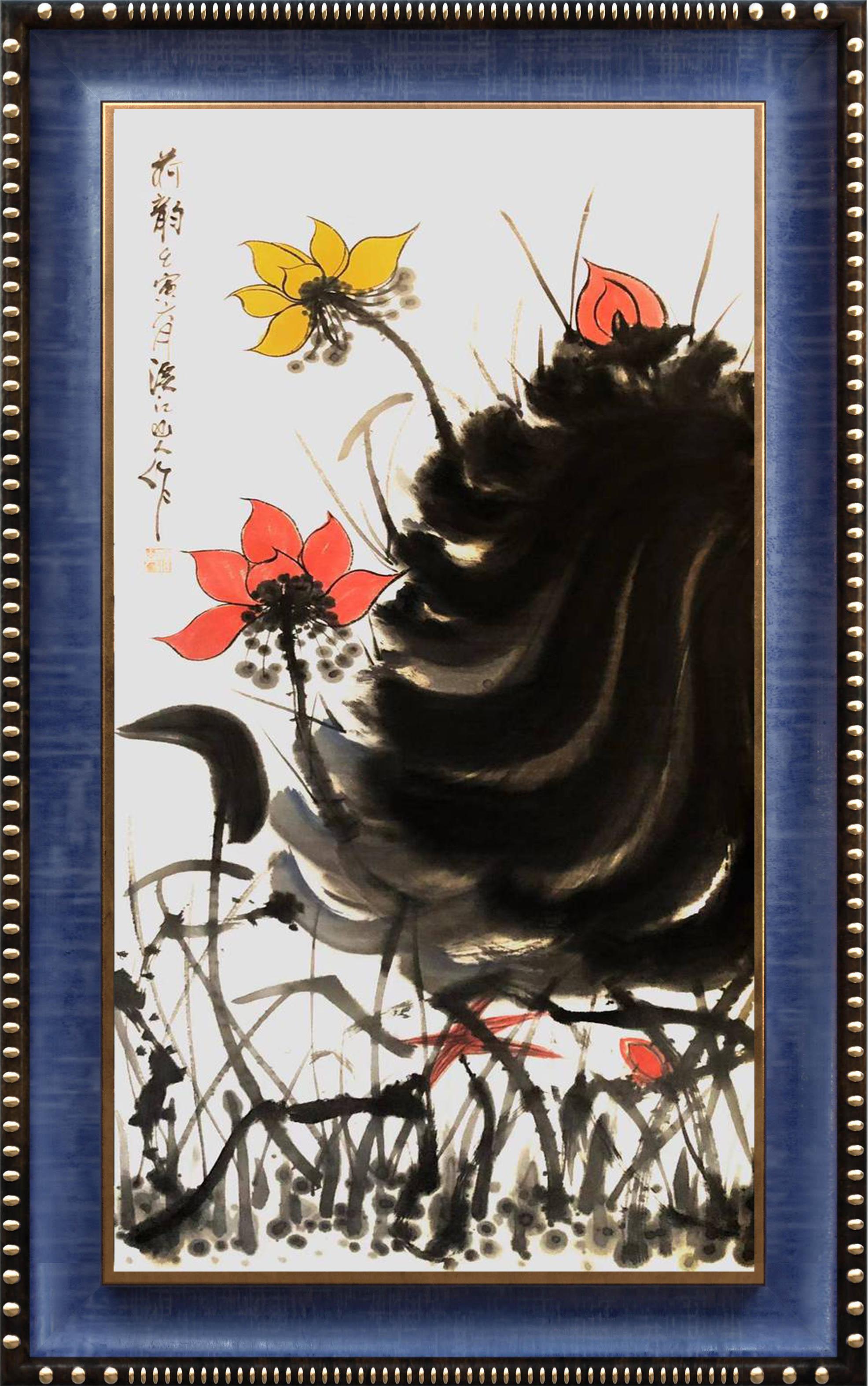 朱祖国先生画荷受石涛、八大山人的影响最大。就个性而言,朱祖国先生是较为接近石涛的奔放,但朱祖国先生能够吸取各家之精髓为己所用。朱祖国先生从石涛取“气”,从八大山人取“韵”,他早就掌握八大山人“面”的泼墨形式来发挥水墨,并创出意气飞扬的画风。再吸收宋人体察物情之“理”,因此,朱祖国先生所画的荷花,无论写意、设色、水墨皆精绝当世,实集古今画荷之大成。
