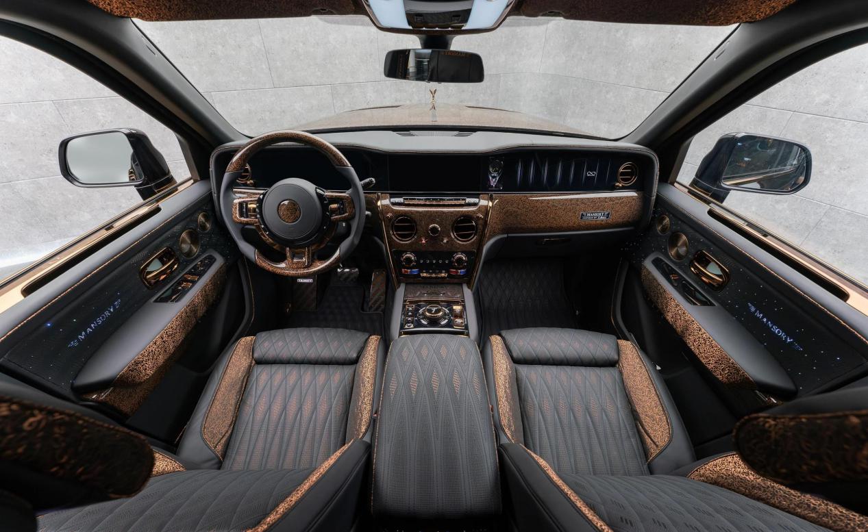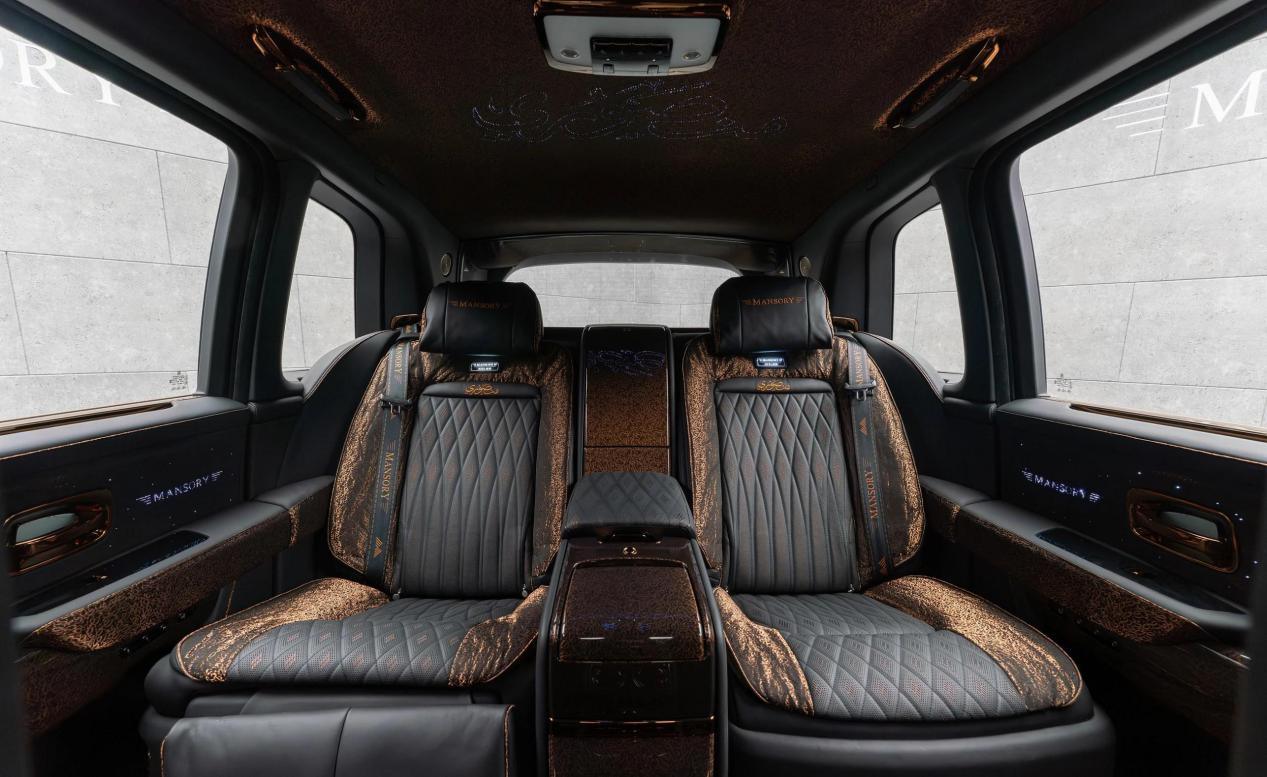 进入车内,奢华的氛围更加浓厚。黑色和古铜色的皮革内饰,搭配上阿拉伯文字刺绣的座椅和头枕,营造出一种神秘而尊贵的东方韵味。这种设计绝对是重口味,但你无法否认它的精致和用心。每一针每一线,都体现了Mansory精湛的工艺和对细节的极致追求。这可不是流水线生产出来的产品,而是货真价实的艺术品,甚至可以说是一件可以移动的艺术装置。想象一下,坐在这样的车里,听着舒缓的音乐,看着窗外流动的风景,那种感觉,恐怕只有亲身体验过的人才能真正理解。