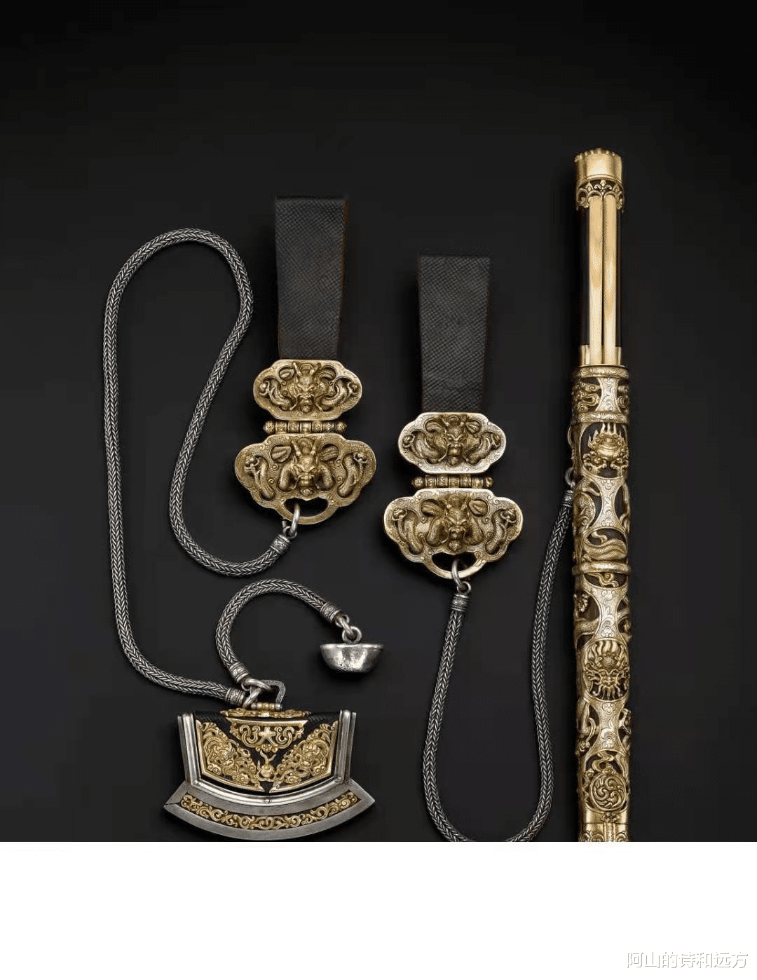 再看那个乾隆年间的银鎏金龙纹刀具,一套四件,刀鞘木质,镶嵌银质,通体鎏金,镂空刻云龙戏珠纹,龙身随着圆柱体不断运动并且若隐若现,体现变化之美。这种动感同样应用在正面龙首及层叠交错的龙身上,富有立体感。据推测,应为皇室或王侯贵族使用之物。
