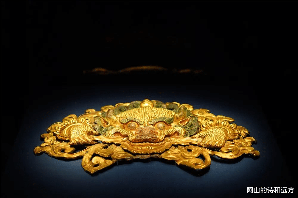 你看,铜鎏金佛像冠上除了铜和玻璃外,还有金、绿松石、水晶,其五叶象征五方佛,代表佛像的神圣和庄严,五叶下方装饰有“荣耀之脸”作为保护神,双手执着向上伸延代表永生的花枝。何为荣耀之脸? “荣耀之脸” 又称紫班札,“紫班扎”这个名字为藏语音译,最初来自印度神话的梵语,汉语译作“荣耀之脸”,也称“天福之面”,是一只仅剩头颅的贪婪怪兽,有着尖利的触角、凸出的双眼和巨大骇人的嘴。展览中的银鎏金璎珞、金嵌绿松石新年礼仪肩饰等多件精美器物上都装饰有“荣耀之脸”。