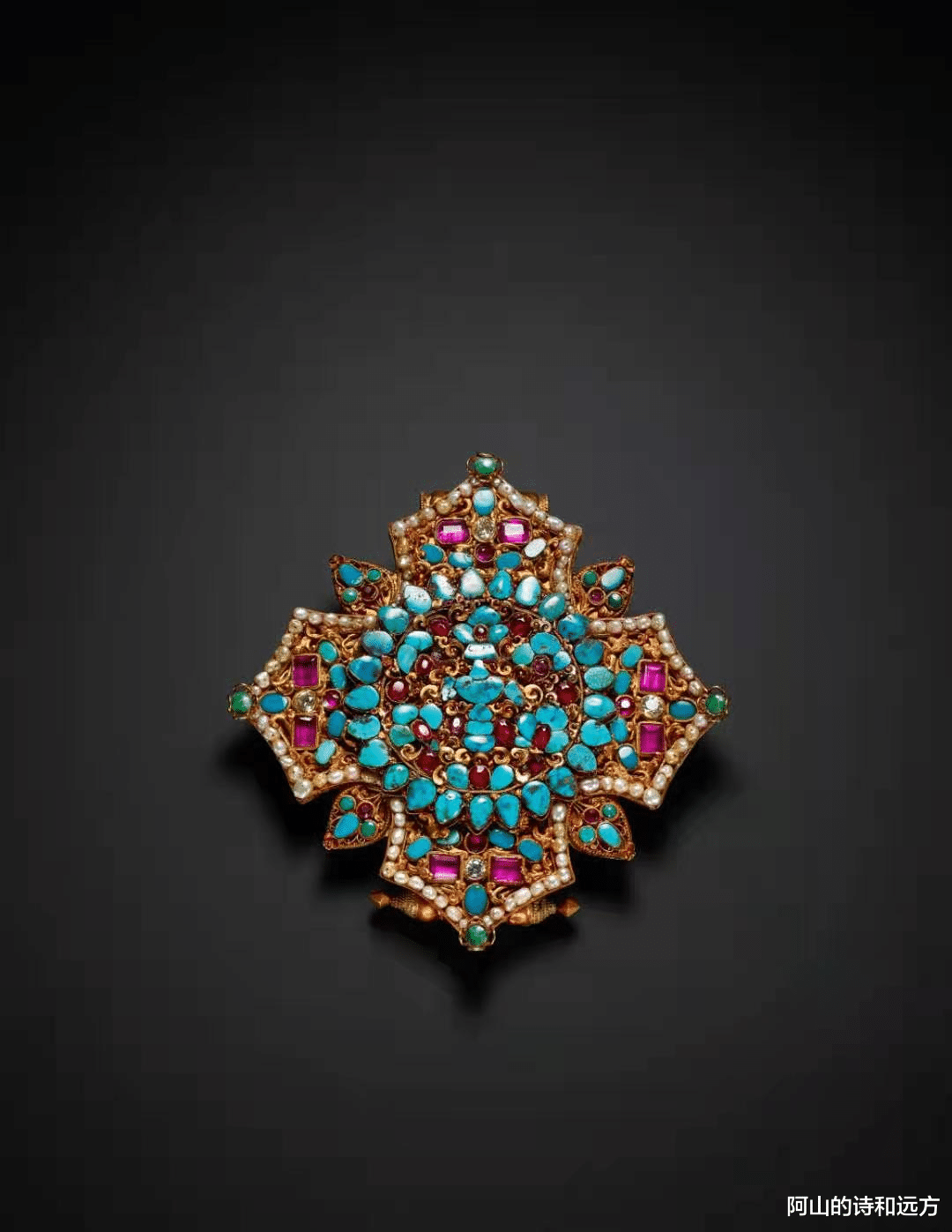 看看金嵌玻璃半宝石十字形嘎乌盒,四个大尖角处各装饰金花一朵,绿宝花心,盒中心镶嵌一颗绿松石宝瓶,25颗水滴形绿松石环绕一周。看上去真的是珠光宝气哦。