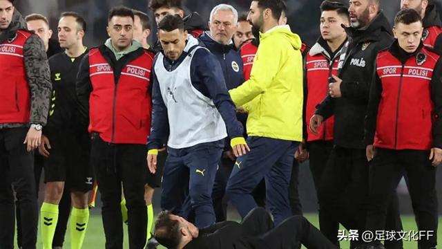 穆里尼奥与加拉塔萨雷主帅布鲁克发生冲突,布鲁克被穆里尼奥捏鼻子后戏剧性地倒在地上。