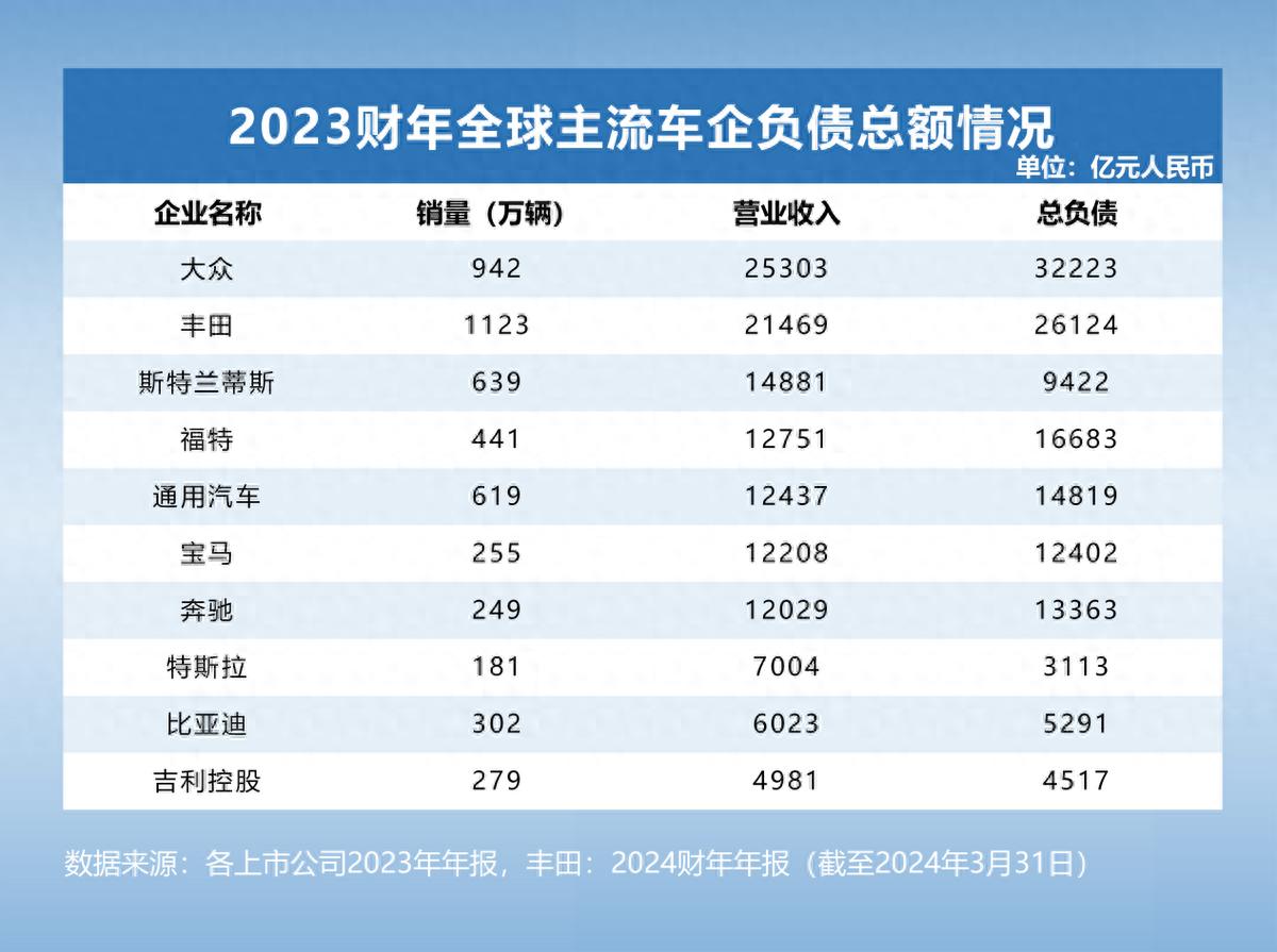 财报显示,2023年,大众集团营收2.5万亿元,总负债达3.2万亿元,比同期营收高28%;丰田营收2.1万亿元,总负债达2.6万亿元,比同期营收高24%。仅大众与丰田两家头部车企的总负债就达到近6万亿元,像福特、通用、宝马、奔驰等车企总负债也超万亿。可以看到,海外主流车企的总负债都是“万亿户”,处于较高的水平。