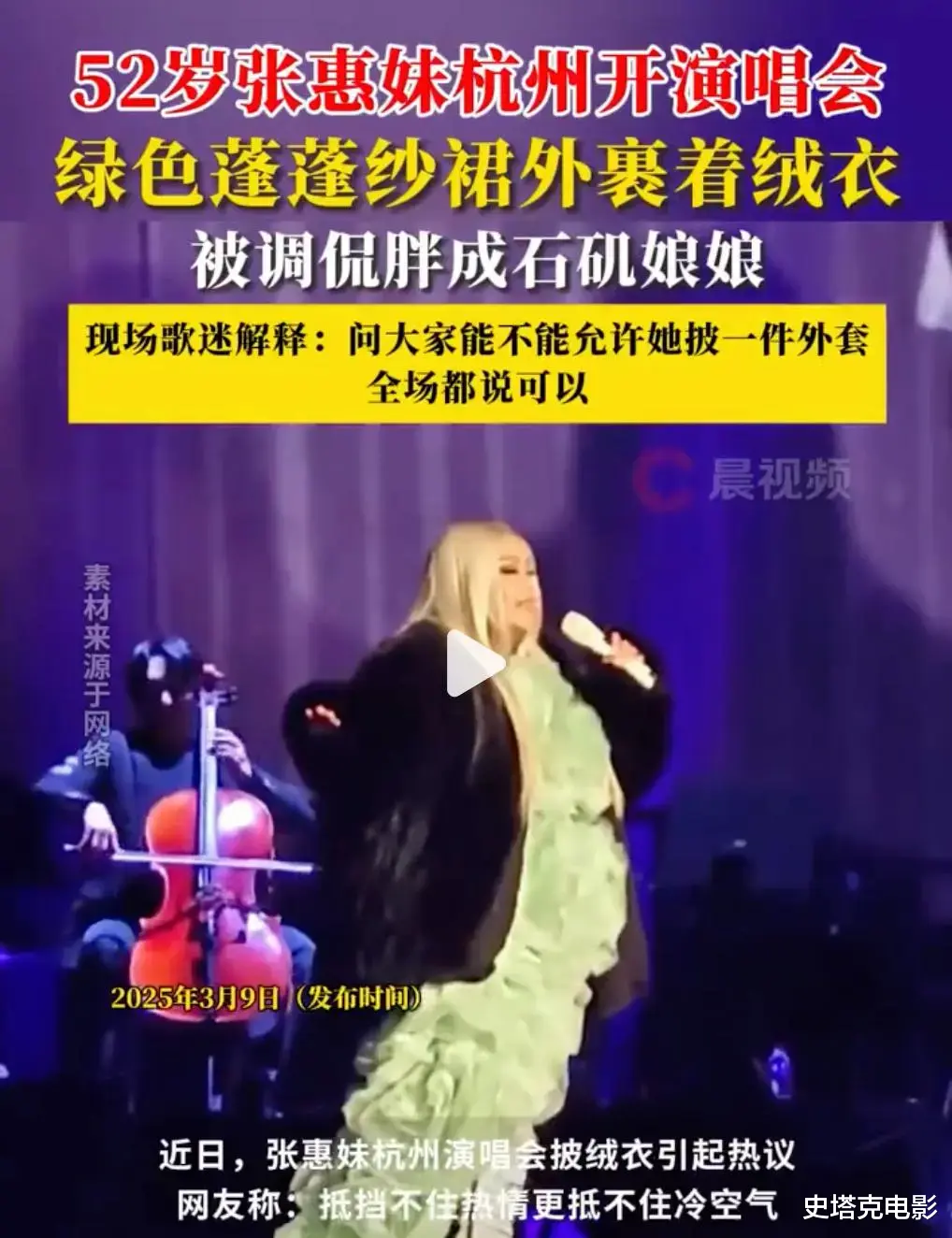 在演唱的过程中,也许是现场温度太低了,张慧敏还感冒流涕了,于是她主动征求现场的观众,给她加上了一件黑色的外套。