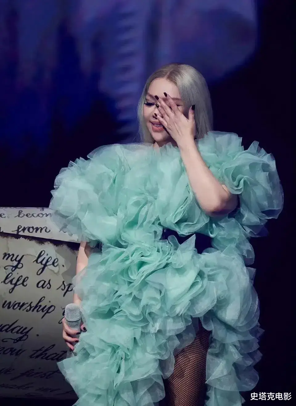 不过,明星们为了造型需要,经常会穿一些造型很夸张或者是很亮眼的服装,这一次的张惠妹,顶着一头时髦的银发,身穿绿色的蓬蓬纱裙出场了。