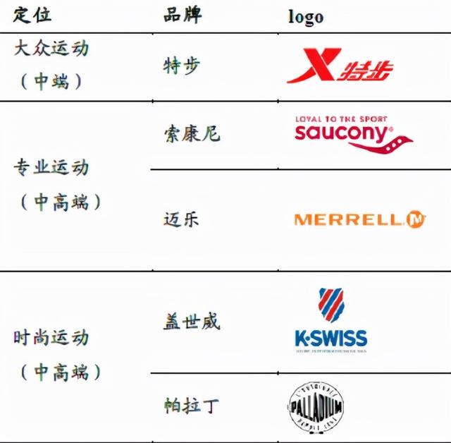 特步旗下现有5大品牌,分别是主品牌特步、专业运动的索康尼和迈乐、时尚运动的盖世威和帕拉丁。