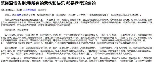 乒乓世界杂志2014-04-24报道:范瑛深情告别:我所有的悲伤和快乐,都是乒乓球给的