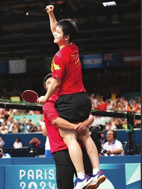 在获胜的那一刻,全场沸腾,作为教练的王皓更是冲进场内,抱起来他的徒弟樊振东。