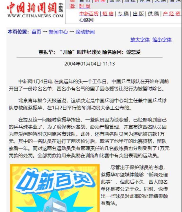 参考来源中国新闻网2004-01-09报道:南方周末:只能爱乒乓 禁止爱上队友