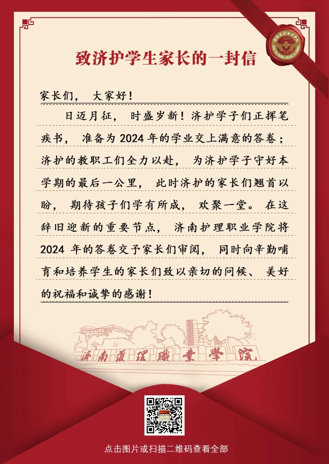 日迈月征,时盛岁新!济护学子们正挥笔疾书,准备为2024年的学业交上满意的答卷;济护的教职工们全力以赴,为济护学子守好本学期的最后一公里,此时济护的家长们翘首以盼,期待孩子们学有所成,欢聚一堂。在这辞旧迎新的重要节点,济南护理职业学院将2024年的答卷交予家长们审阅,同时向辛勤哺育和培养学生的家长们致以亲切的问候、美好的祝福和诚挚的感谢!