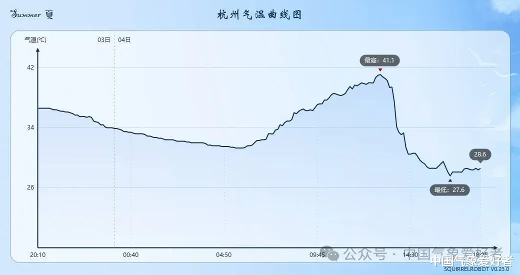 8月4日下午1点前后,极端酷热的杭州气温超过41度,眼看着又要打破纪录。就在这关键时刻,一团浓密的积雨云腾空而起,遮挡住了阳光,而后炸雷阵阵,狂风暴雨落下。在此过程中,杭州气温一小时暴跌10度,6小时暴跌13度,最低下探到28度上下。这个温度已经低于近期杭州凌晨的最低温,是8月杭州经历过的最低温度。