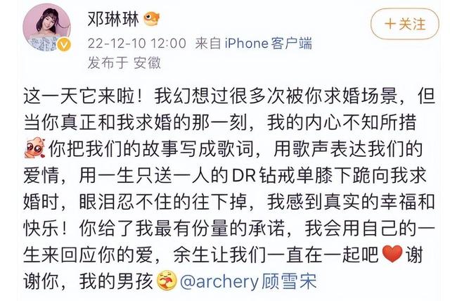 渐渐地,两人互生好感走到了一起,并在2022年12月10日,邓琳琳在社交平台上官宣了自己被顾雪宋求婚的喜讯。