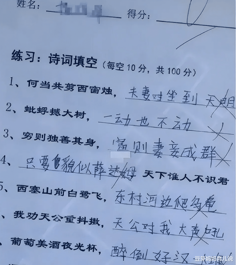 看看下面这个“0分试卷”,诗词填空题,人小鬼打大的小学生如何自创诗词的: