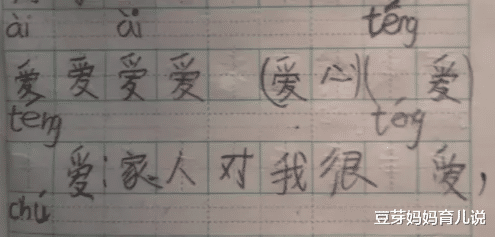 这是大宝二年级的作业,用 “爱”组词造句,我定睛一看,原来是: