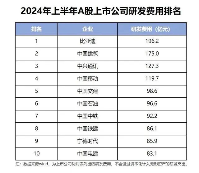 很多人看到薄利多销就容易联想到降配或减质,比亚迪可对不上号。前不久,比亚迪上半年核心数据显示,营业收入3011.3亿元,同期增长15.76%,净利润也有136.3亿元,这收入可不低能排行业第一,结果比亚迪上半年的研发投入就投进去196.2亿元,远超净利润,也排行业第一。除了汽车行业,其研发费用在A股超5300家上市公司中也处于领先地位,堪称A股“研发之王”。