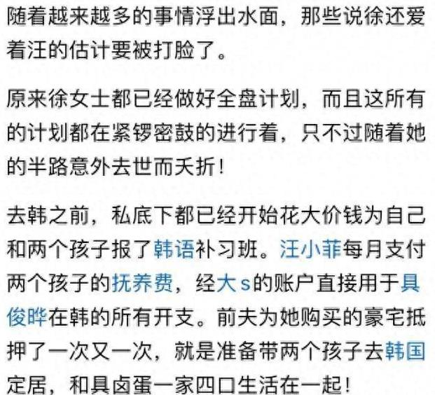 无疑,遗产分配方案是这场争执的关键,其内涵让人难以捉摸。根据法律,具俊晔有权继承大S三分之一的资产。然而,台湾地区的法规如同给这笔遗产套上了沉重的枷锁,明确规定只能在岛内使用。这一限制,如同一把利刃,瞬间切断了具俊晔与S妈之间看似牢不可破的利益关系。曾以“守护孩子”为口号的S妈,如今在社交平台上频频发布“心破洞难补”“遇骗子悔恨”等充满悲怆感的文字,令人对她在遗产争夺过程中的遭遇感到怜惜,也引发了公众对这一复杂关系的深思。而汪小菲坚决收房的举动,背后同样藏有更大的内幕。据透露,大S生前曾将该房产抵押,用于在首尔购置资产。如果这一信息属实,具俊晔可能将面临跨国的资产追讨,这场遗产争夺战将因此变得更加复杂,充满不确定性。