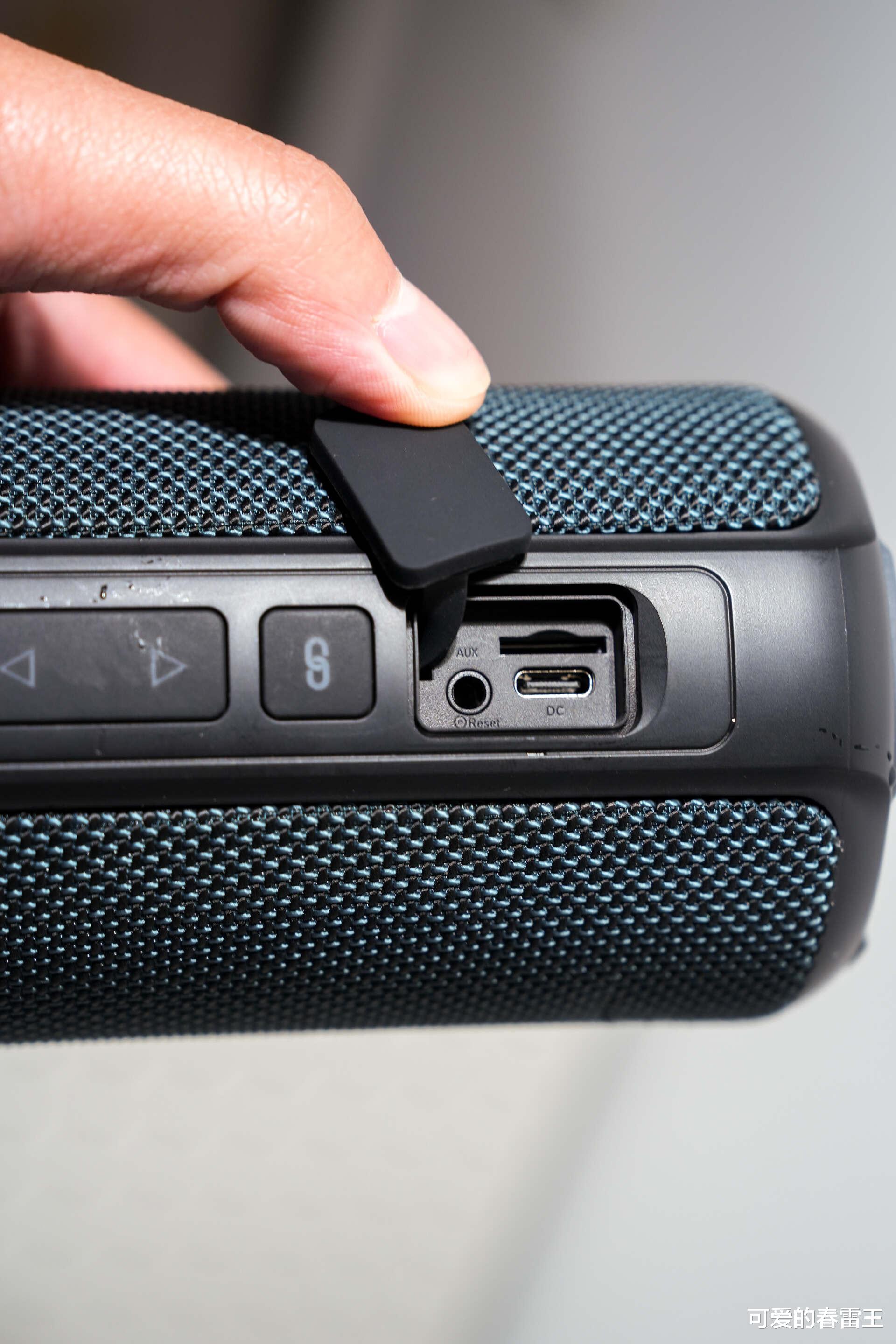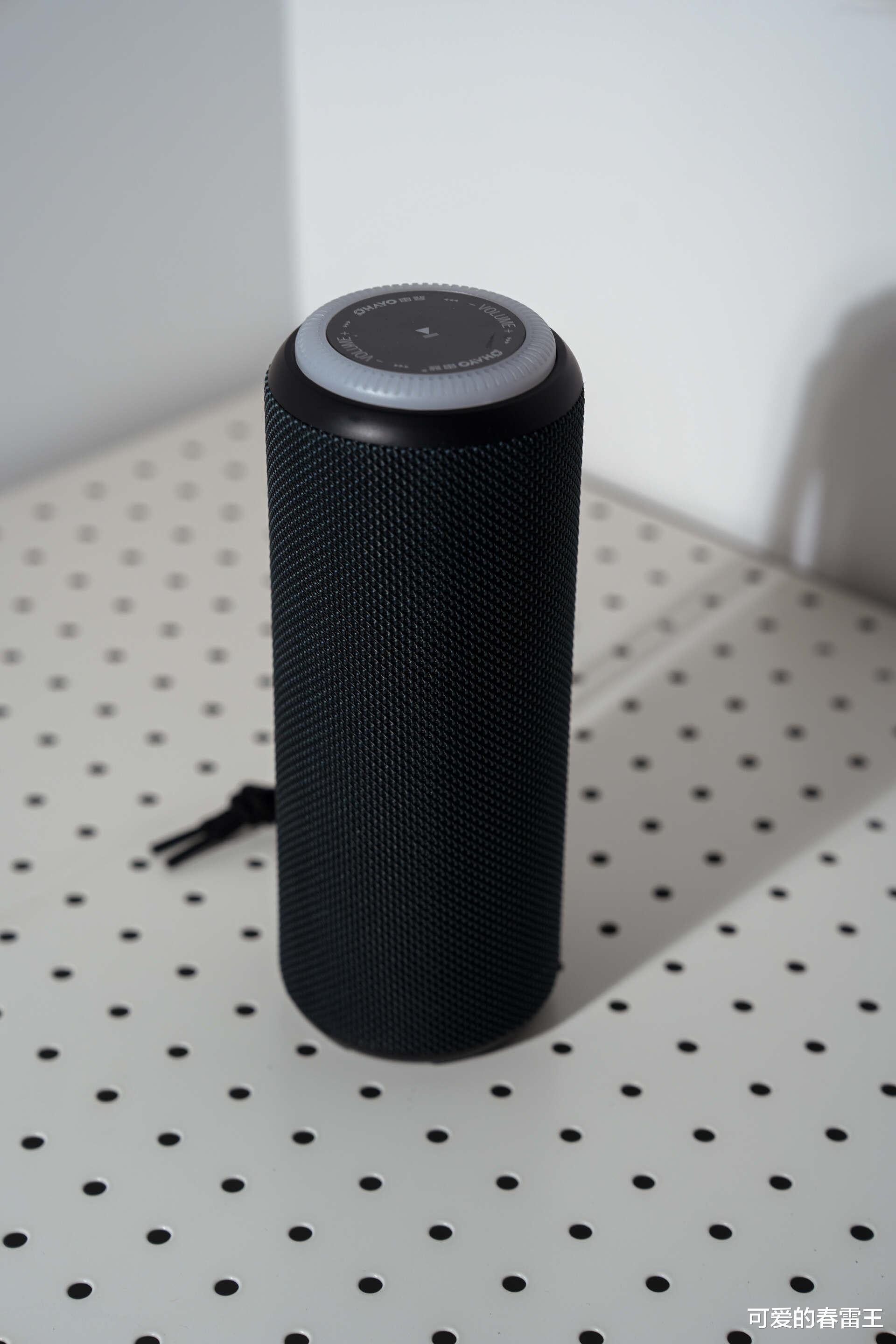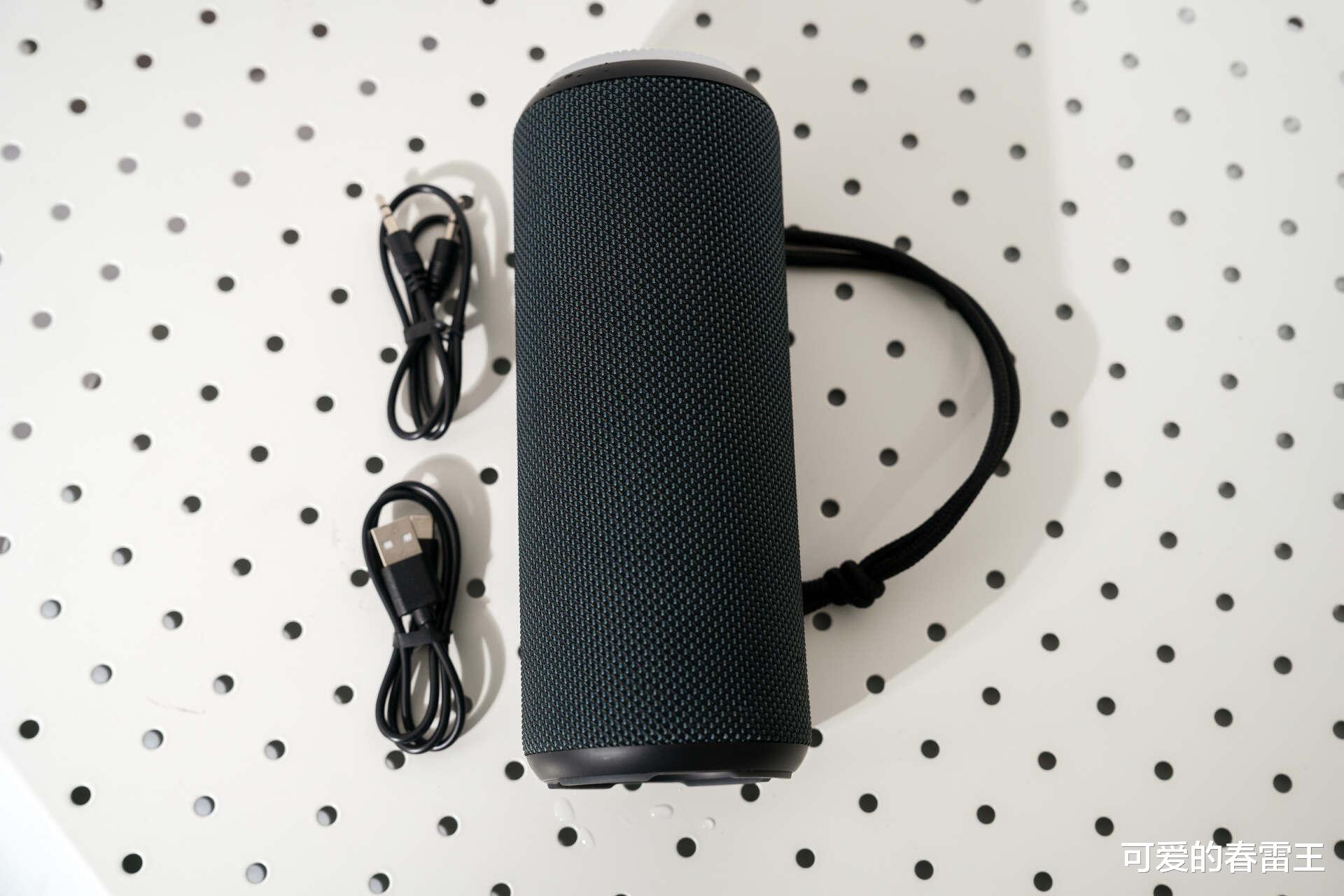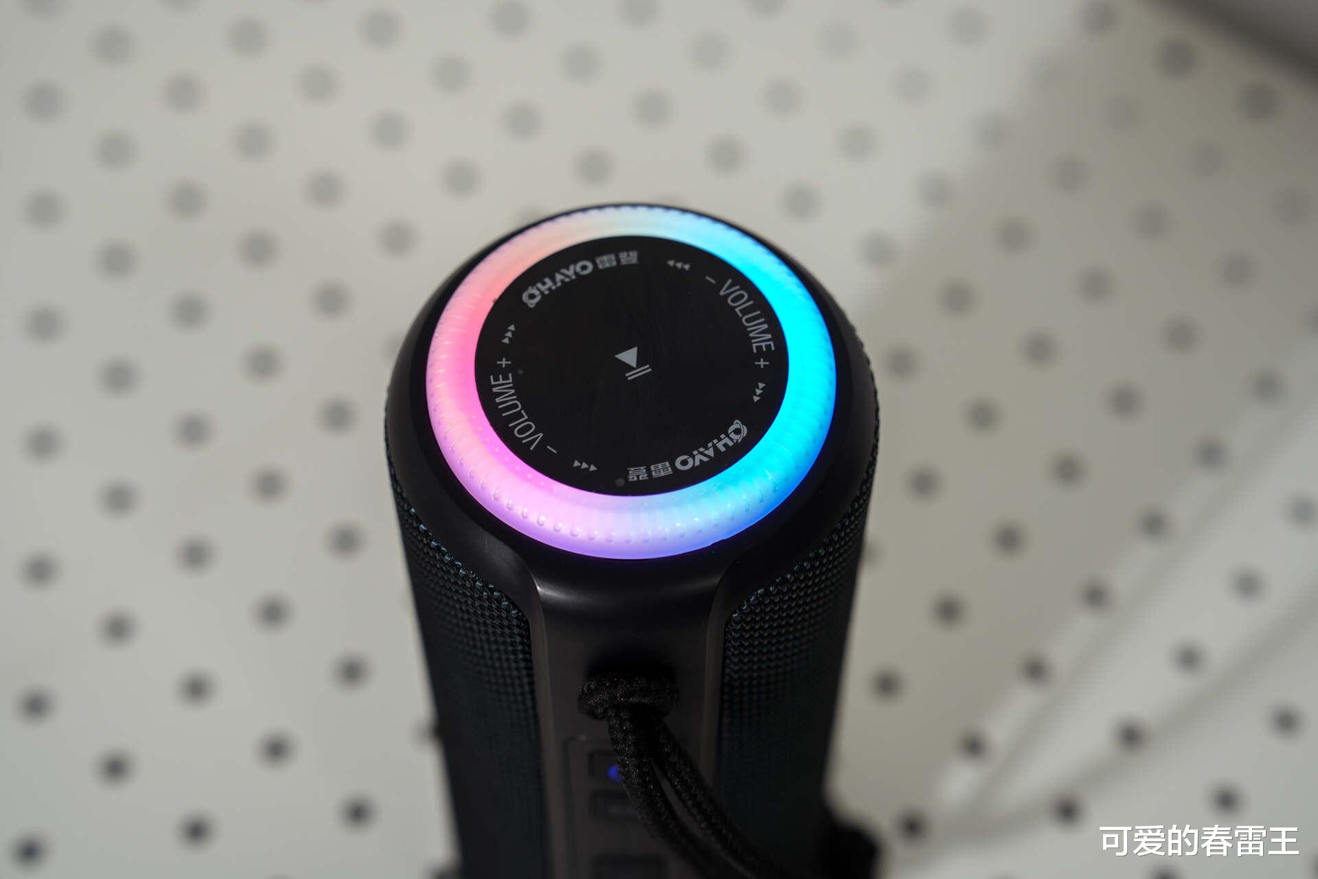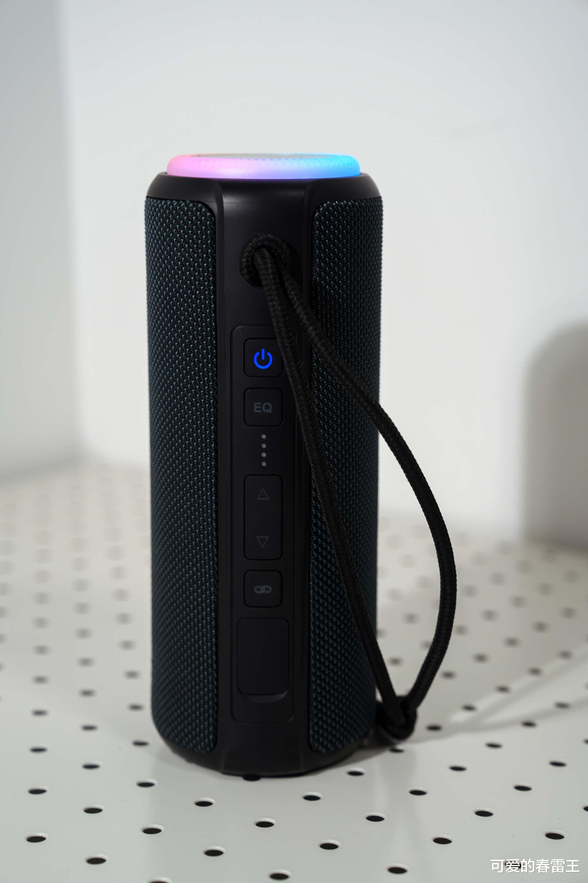 当然,在外观设计方面,我最主要的还是想说说它的RGB炫彩流光灯效。播放音乐时,它的灯光都会跟着音乐的节奏律动,特别有氛围感。每次休息日时,约上三五好友去露营,晚上坐在一起听听歌,看看星星,聊聊天天,再加上灯光的加持,很难不让人沉醉其中。它的顶部还有旋钮设计,可以很轻松地调节音量和切换音效模式,无需弯腰或寻找按键,非常人性化。