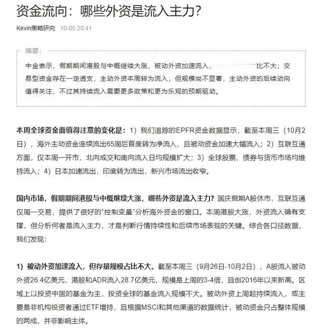 海外资金:EPFR显示主动外资转为流入。截至本周三(9月26日-10月2日),A股主动外资转为流入1.9亿美元(vs. 上周流出2.0亿美元),被动资金大幅流入26.4亿美元(vs. 上周流入6.7亿美元);与此同时,港股和ADR海外资金整体加速流入29.9亿美元(vs. 上周流入5.3亿美元),其中主动资金转为流入1.2亿美元(vs. 上周流出2.8亿美元),被动资金大幅回流28.7亿美元(vs. 上周流入8.1亿美元)。