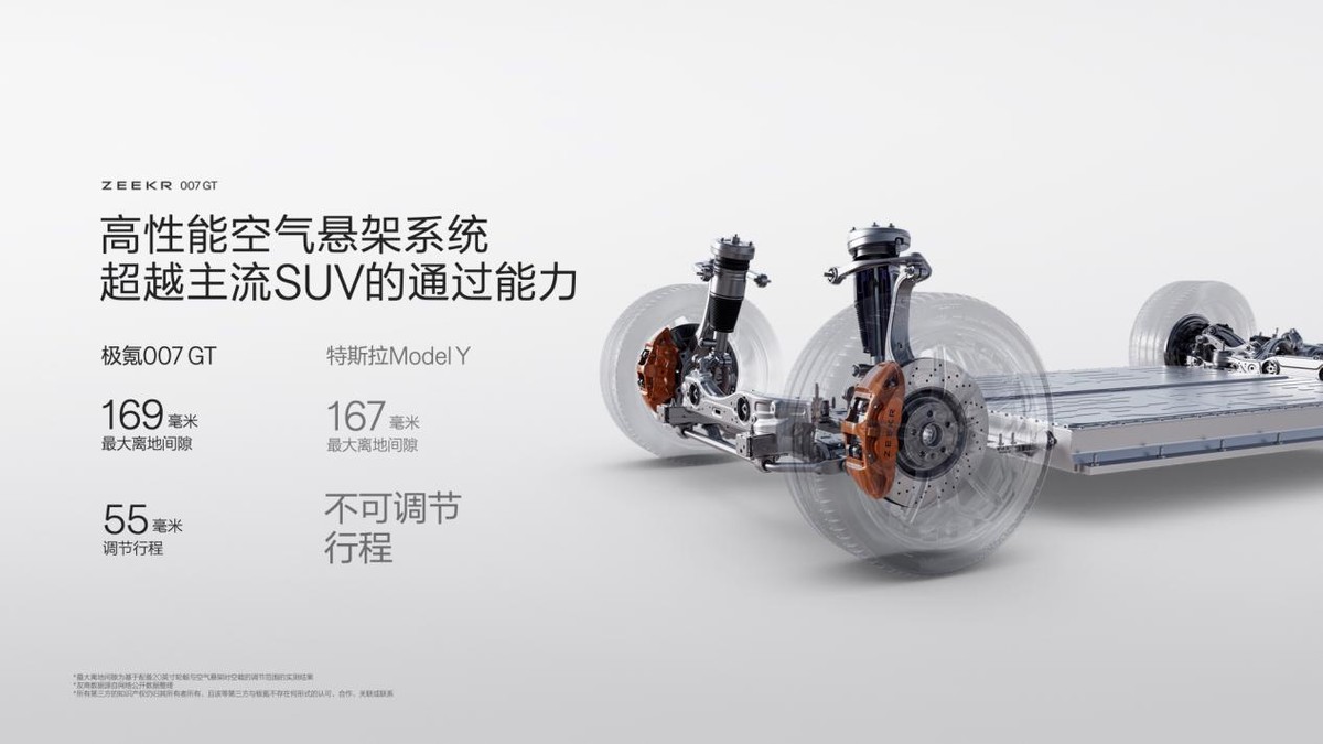 极氪007GT配备高性能空气悬架,调节行程55毫米,最大离地间隙169毫米,超越很多主流SUV。全系标配CCD电磁减振系统和智能魔毯功能,同级唯一,能够智能调节阻尼控制底盘软硬,提前感知前方凸起路面,毫秒级改变悬架状态,用科技优化通过性,兼顾操控性和舒适性,无论长途远行还是日常驾驶,为用户带来百万级豪车的驾乘质感。