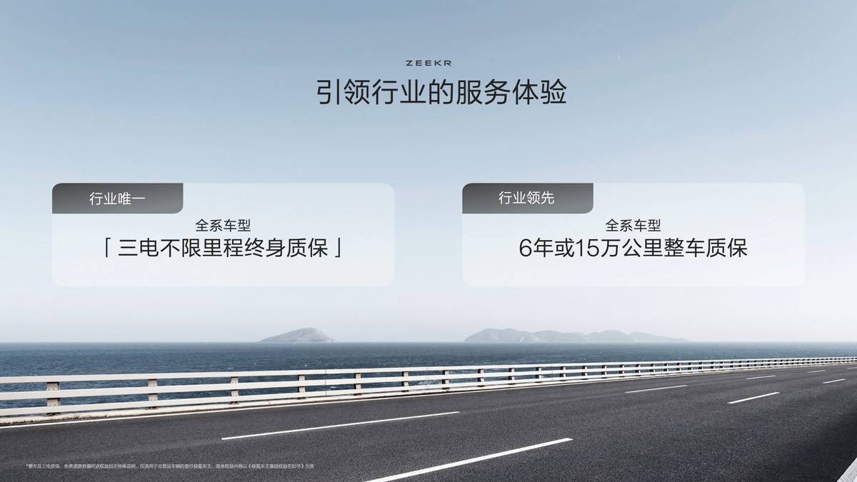 豪华服务,要有引领行业的服务体验。极氪提供全系车型“三电不限里程终身质保”,行业唯一,并在全行业率先取消关于长期停放的全部免责条款。极氪提供高速免费救援服务,行业唯一。新车4年或10万公里内免费道路救援,覆盖全国任何道路,高速拖车费用不限里程全额报销,行业唯一。 还有“1小时快保,24小时快喷”、远程预警诊断及主动提醒、车辆代客值守、免费取送车、免费维保接送等服务,新老用户同享。