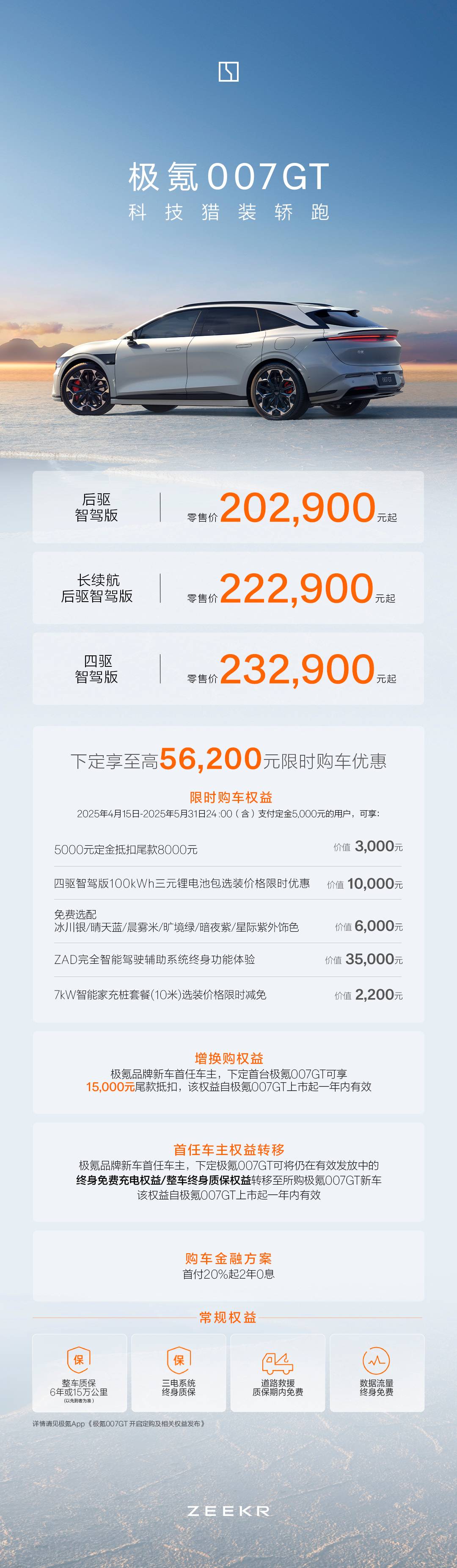 2025年4月15日到2025年5月31日(含),所有支付定金5000元的用户,可享至高5.62万元限时购车权益,包括:下定极氪007GT全系车型,可享5000元定金抵8000元尾款,免费选配价值6000元外饰色(冰川银/晴天蓝/晨雾米/旷境绿/暗夜紫/星际紫),价值35000元ZAD完全智能驾驶辅助系统终身免费功能体验,7kW智能家充桩套餐(10米)选装价格限时减免2200元。下定极氪007GT四驱智驾版,还可享100kWh三元锂电池包选装价格限时优惠10000元。