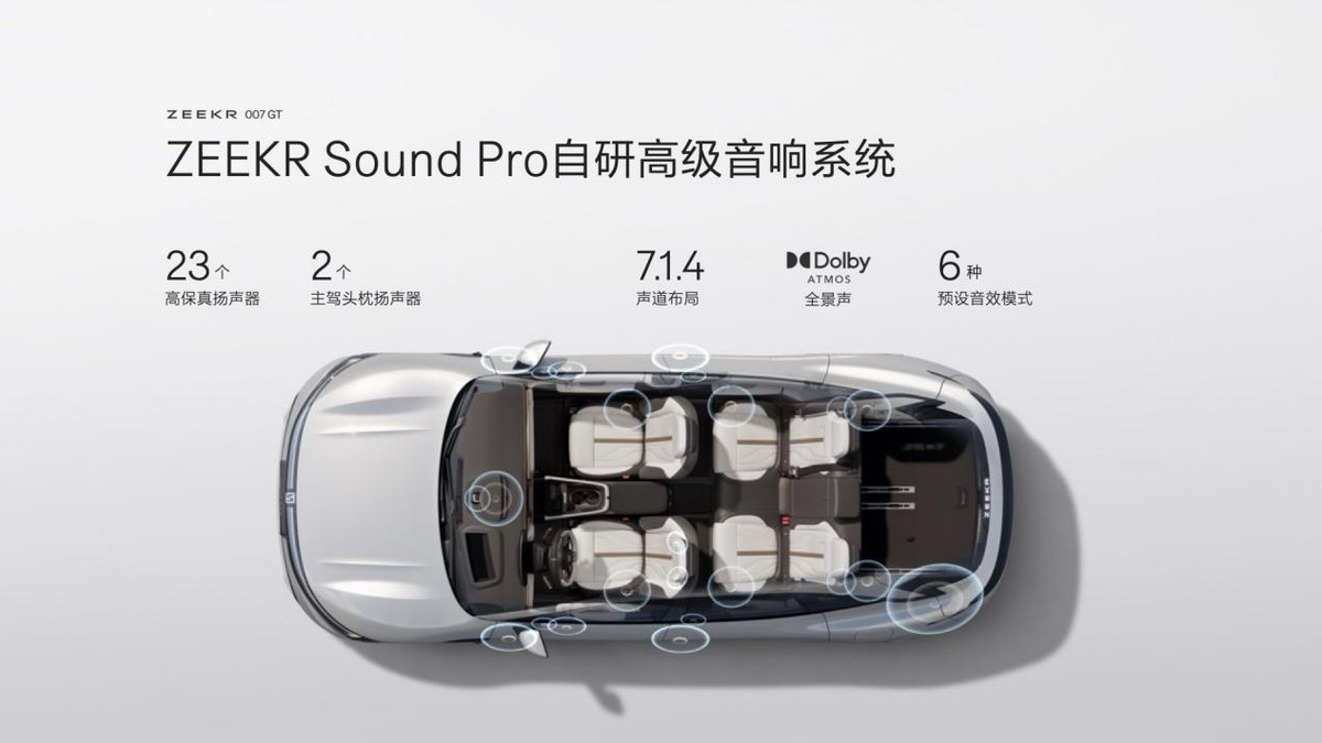 极氪007GT不仅是人生舒适区,还是移动影音室。搭载Zeekr Sound Pro自研高级音响,峰值功率2160瓦,23个发烧级高保真扬声器,7.1.4声道设计,支持杜比全景声,把电影院搬进车里。标配四门双层夹胶隔音玻璃,运用声学影像投影技术,极氪007GT的NVH表现行业领先,超静谧空间让用户畅享沉浸式体验。