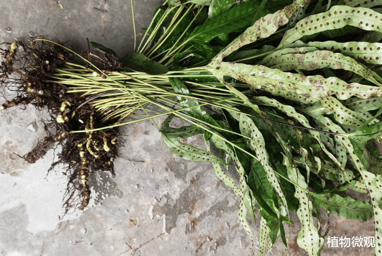 金鸡脚也叫鸡脚叉、辟瘟草、鸭脚掌、三叉剑、鸭脚草、鸡脚七,它是水龙骨科、假密网蕨属多年生蕨类植物。和有着“肾茶”之称的石韦是近亲,同属于水龙骨科蕨类植物。金鸡脚根茎细长,常附身于岩石峭壁上。它的根横生,上面密布红棕色的鳞片,非常典型的蕨类植物。