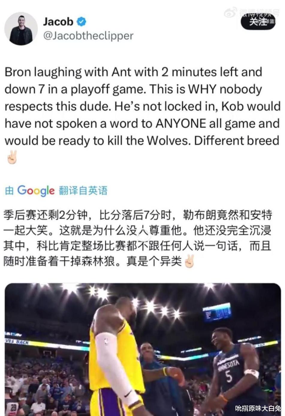 美国记者Jacob说詹姆斯是老好人,落后7分,竟然跟爱德华兹一起大笑,这就是没人尊重他的原因。如果是科比,肯定不会说话,而是想着是随时准备干掉森林狼。美国球迷支持他的认为,詹姆斯都拿5万分了,还要他怎样?全场拿了38分,别整这些。