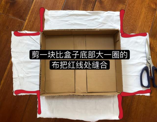直接按照下图所示,把衣服裁剪成比纸盒稍微大一圈,接着把红线处和纸箱处紧紧的缝合在一起,那你就基本上完成了80%了。