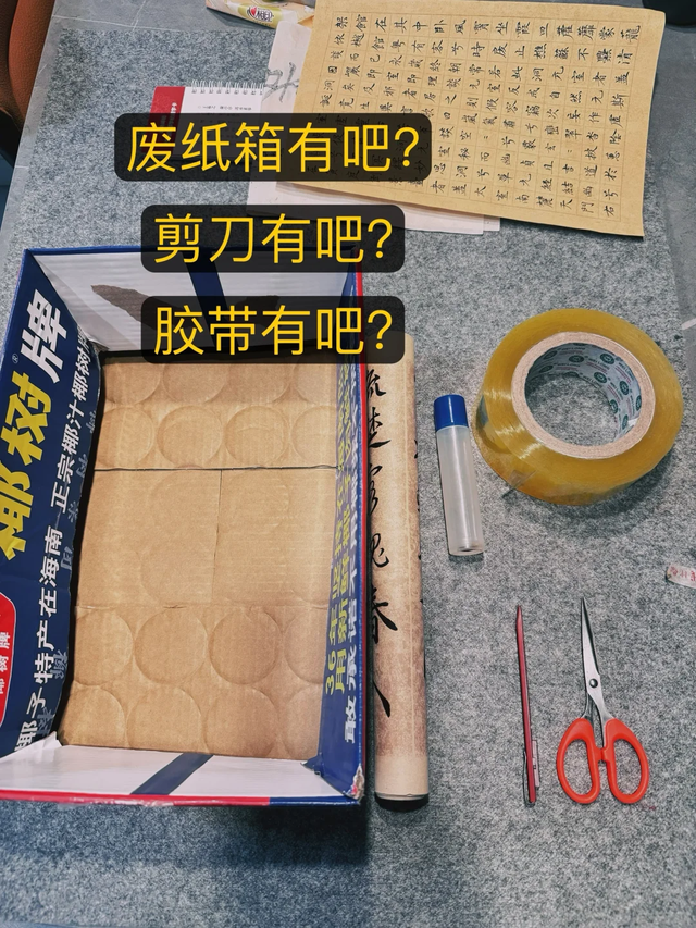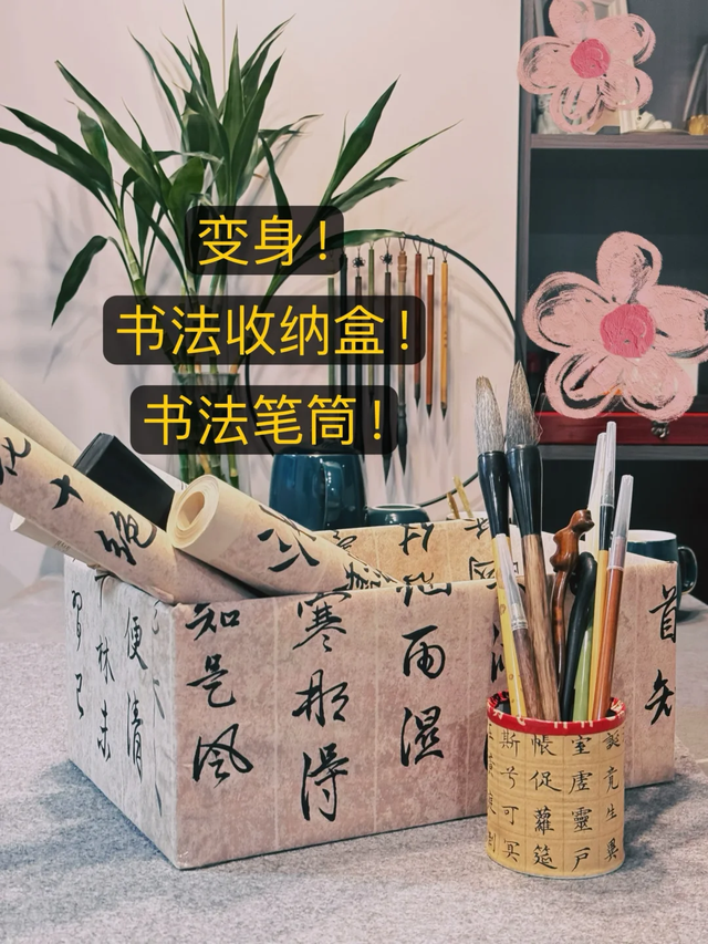 可以用家中的废纸箱和胶带改造一个书法收纳桶,方法非常的简单,就是把纸箱剪出你想要的形状之后,把你写过的字帖直接粘在上面就可以了,你就可以拥有一个古风收纳桶了。