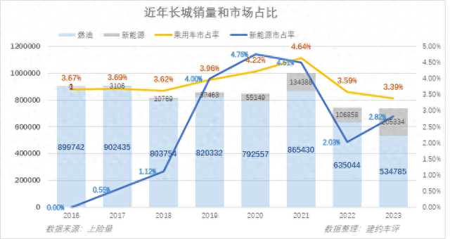 数据看上去光鲜亮丽,而实际距离长城设定的年度目标还相差很远,2023年中国整体乘用车市场的渗透率是33.33%,显然,长城新能源转型的速度还慢于大盘,仍然处在追赶阶段。如果只计算乘用车上险量,自2016年乘用车整体上险量突破2000万以来,2023年是长城乘用车上险量最低的一年,只有74万辆,同比增速-0.24%。在整体市场中的市占率已经下滑到3.39%,其中新能源市占率也仅有2.82%,落后于长安、吉利等老对手。长城第一大品牌哈弗的销量几乎创造了10年来的新低,就连哈弗自己的员工都把坦克和皮卡形容为长城如今的护身符。而刘艳钊作为坦克和魏牌双品牌的CEO明显可以感觉到,他在坦克发布会上的发言更有底气。