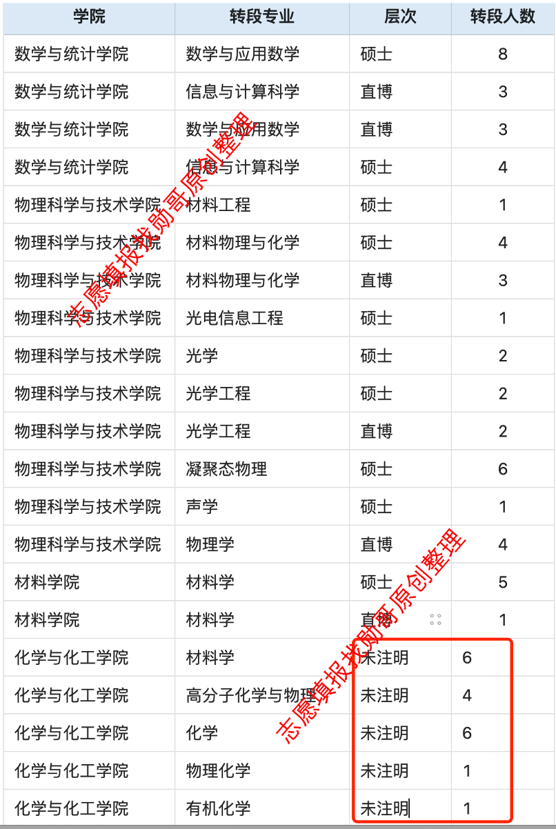 比如4人转段物理学专业,全部直博,材料物理与化学4人硕士,3人直博。信息与计算科学和数学与应用数学专业,都是3人直博,但数学与应用数学总人数要比信息与计算科学人数多很多。