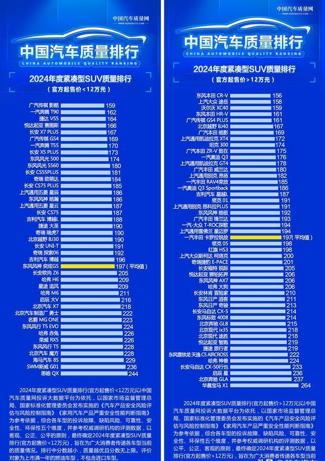 话说有这么一份燃油紧凑型SUV质量榜单,这里面合资车型和国产车型在品控方面的表现可以说是各占半边天呐。您瞧啊,价格低于12万的那些车型呢,大部分都是国产车哦,像长安CS75,还有吉利博越L等等,它们在市场上的表现那可真是相当不错呢,而且用户们对它们的口碑也都挺好的。再看看价格高于12万的车型吧,这里头多数就是合资车啦。像CR-V、途岳、皓影以及奥迪Q3这些主流车型,那可都处在质量的一线梯队呢,实力杠杠的。还有威兰达、荣放、探歌以及卡罗拉锐放等等车型,它们的质量表现也是处于中游的水准哦。不过呢,国产车里面也有表现特别出众的,就比如说坦克300啦,那可真是相当亮眼呢。还有年销量拿到第一名的吉利星越L,也凭借着自身的优势赢得了消费者的肯定,确实是很厉害呢。