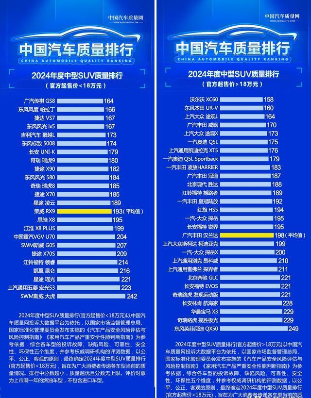 咱们再来瞧瞧燃油中型SUV的品控情况。有那么几款起售价低于18万的车型,像捷达VS7、吉利豪越L、奇瑞瑞虎9还有奇瑞瑞虎8呢,它们的质量分数都比平均值要低哦。不过捷途X70倒是表现得挺出众的呢,还有荣威RX9,它的得分刚好就和平均值一模一样。接着再说说起售价高于18万的中型SUV质量榜单这边的情况吧。那些高品质的车型,比如沃尔沃XC60、奥迪Q5L、凯迪拉克XT5,它们的质量表现可都是相当出色的哟。而且合资车型里的途观L、威飒、凌放以及冠道呢,也都能够成功入围前十名呢。至于现代胜达、撼路者和福特锐界,它们在市场上的表现虽说一般般吧,但品控方面那也是处在一线梯队里的哦。