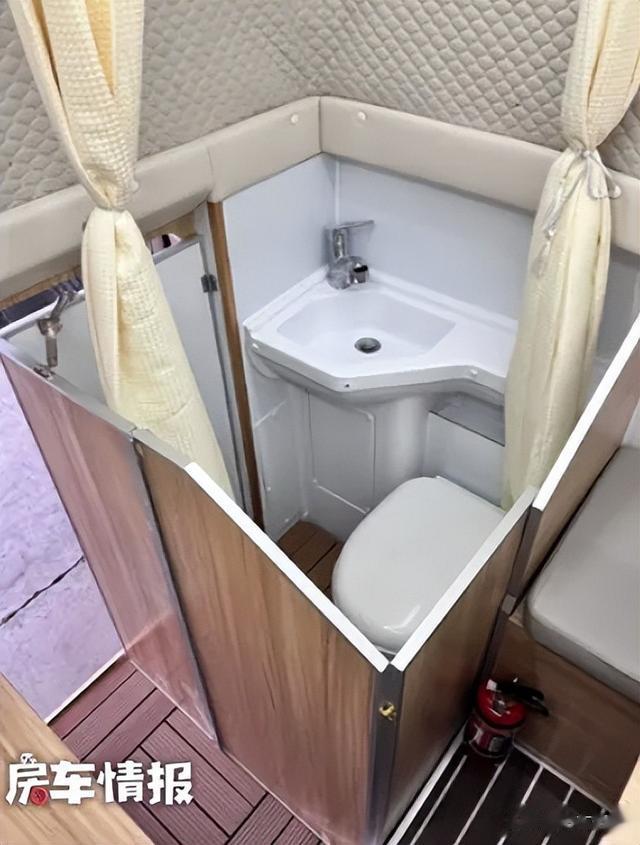 生活区的设计相对就要简单一些,前方有一张额头床并且还可以进行拓展;中部是对卡座沙发,也可拼成一张单人床,尾部则提供了小尺寸的卫生间和空调以及冰箱等设备,另外这款车采用的是后入门的设计。