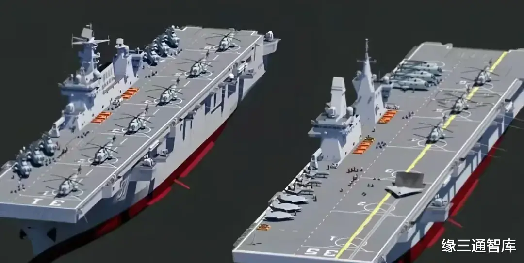 这个076两栖攻击舰安装了一条130米长的电磁弹射器,比福建舰的电磁弹射装置还长17米,可以弹射歼-35舰载机、彩虹-7隐身无人机。