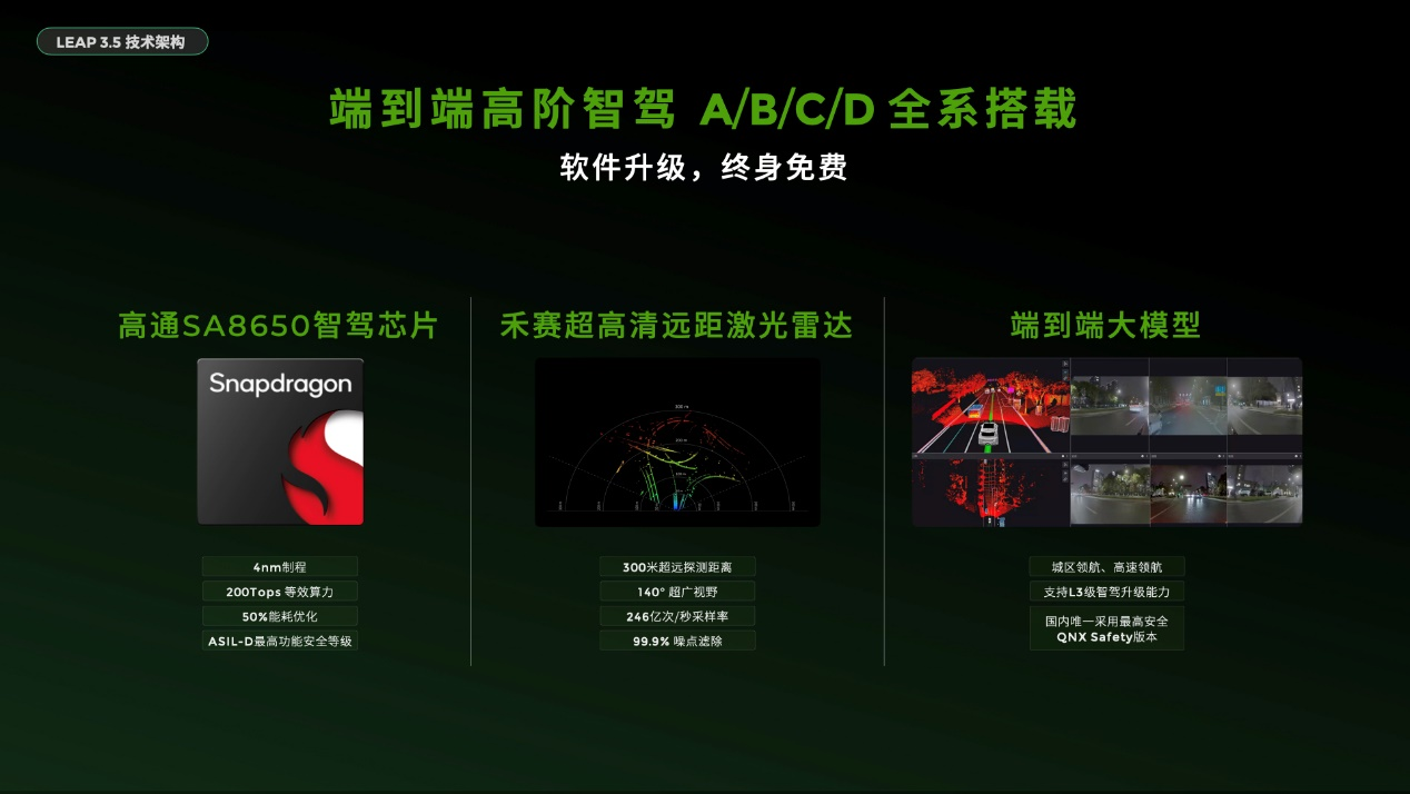 3.高阶智驾系统突破:全球首搭高通8650智驾芯片,以200TOPS稀疏算力实现功耗减半。15万级车型首创300米探测距离激光雷达,配合140°超广视域与高精度点云感知。基于QNX Safety安全操作系统构建端到端智驾模型,支持城区领航及“车位到车位”持续进化能力,推动高阶智驾全民普及。