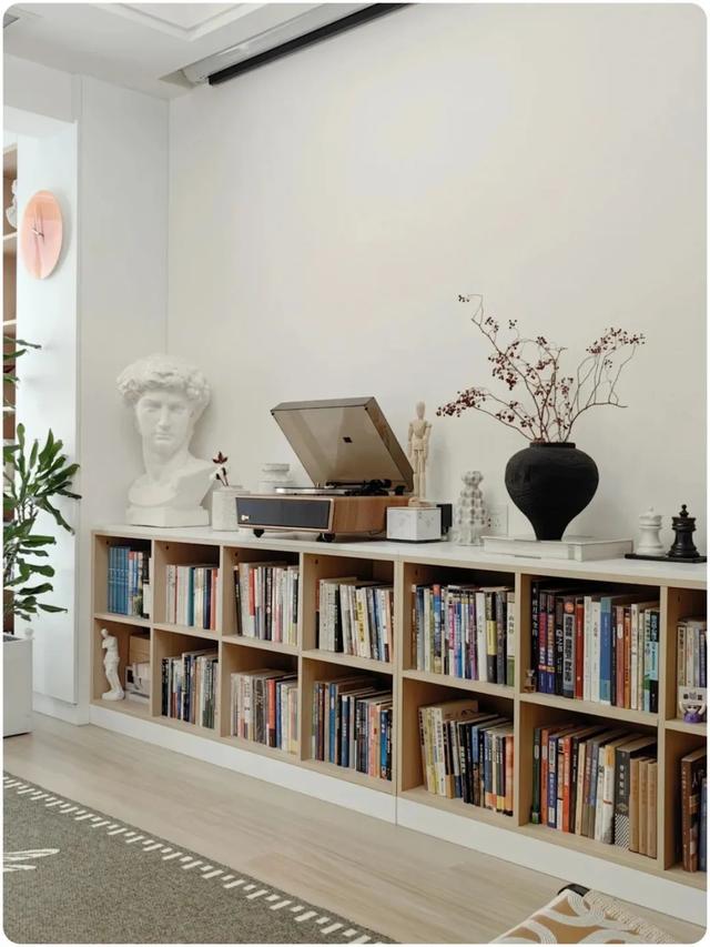 ▲舍弃满墙的电视柜,显得过于压抑,采用定制落地书柜,方便摆放书籍,随意摆放一个石膏头像和一台胡桃木唱片机,提升空间氛围,增添趣味。