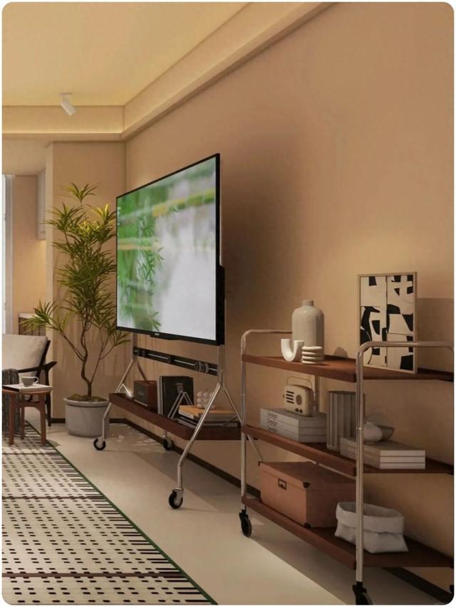 ▲采用电视移动支架,搭配可移动的小推车,用于放置书籍和其他物品,打破了传统电视柜的局限,将电视与书架、储物柜等家具巧妙结合,创造出既实用又美观的居住空间。