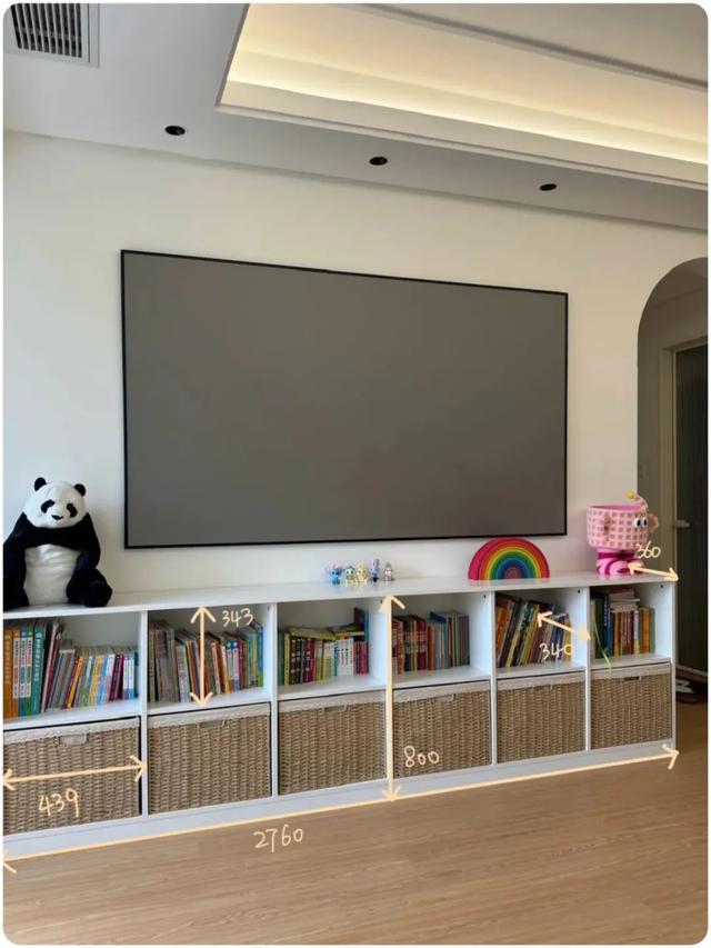 ▲ 定制半高电视柜,上方放置书籍,下方内嵌编织篮,满足储物的需求,同时巧妙遮挡下方插座和路由器,完美实现隐蔽效果。