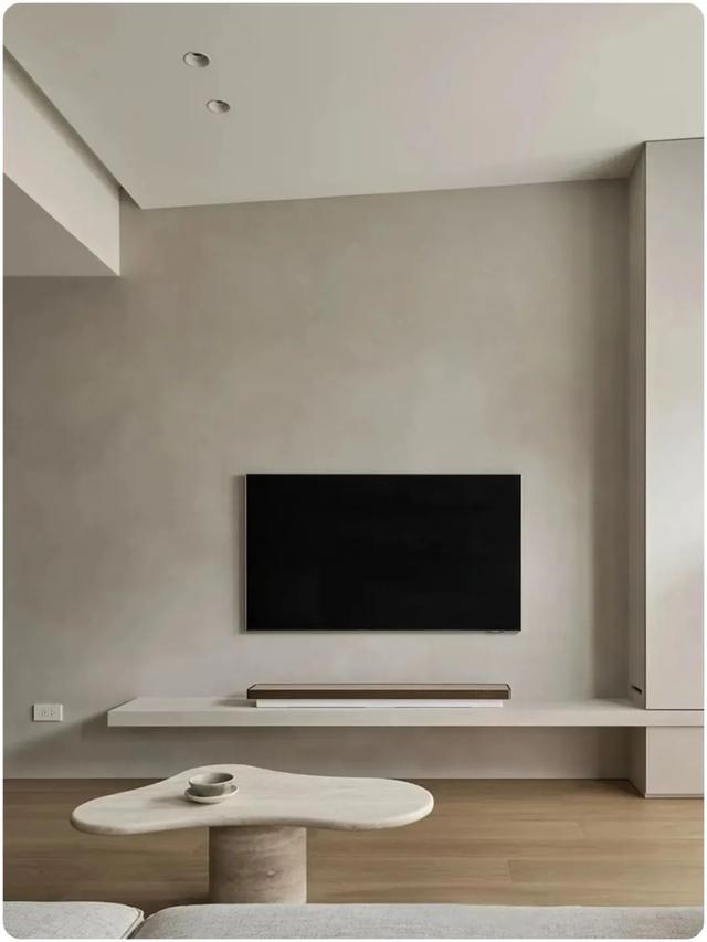 ▲现代侘寂风格,电视墙使用投影幕布,下方加厚的实木板通过金属支架安装,平时仅放置一些装饰品,避免放置较重物品,实现空间的极简与高级感。