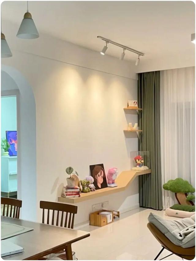 ▲客厅不采用传统电视柜,选择定制高低创意层板来替代传统电视柜,效果非常出色,更具现代感,小空间也能展现出极简舒适的氛围。