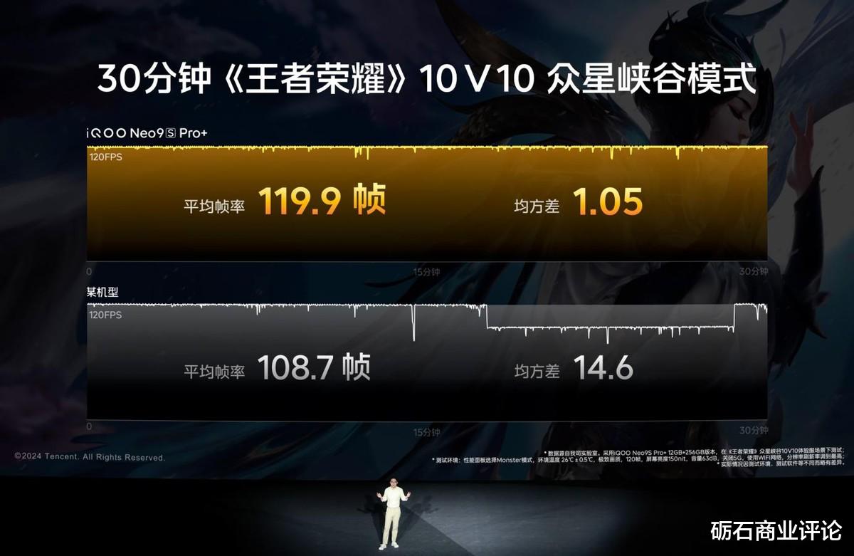 一款性能强大、能耗表现优异且面对高温、重载游戏场景依旧可以稳定、冷静输出的手机,无疑才是游戏玩家心中的“夏日梦想机”。iQOO Neo9S Pro+所搭载的第三代骁龙 8 旗舰芯片与自研电竞芯片 Q1 可谓兼顾性能和能效比的优秀旗舰芯组合,辅以6K天幕VC液冷散热系统,即使长时间重载游戏也能保证始终如一的稳定流畅表现。以《王者荣耀》众星峡谷10V10超重载玩法和35℃高温下玩《王者荣耀》120帧高清模式为例,iQOO Neo9S Pro+半小时游戏平均帧率接近满帧且帧率稳如直线,制霸手机游戏性能赛道。