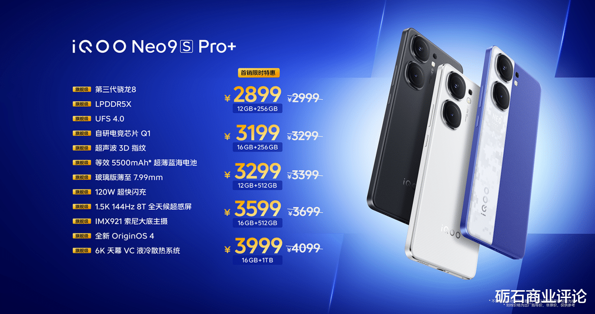 iQOO Neo9S Pro+共有Buff蓝、星曜白和格斗黑三种配色,提供12GB+256GB、12GB+512GB、16GB+256GB、16GB+512GB和16GB+1TB存储组合可选,到手价2899元起;iQOO WATCH GT eSIM版售价799元起,蓝牙版499元,7月11日—7月22日下单蓝牙版立减20元,到手价仅需479元; iQOO Pad2 Pro到手价 3299元起;iQOO TWS 1i售价 99元,与iQOO Neo9S Pro+组合购买可享至高40元优惠,到手仅需59元。