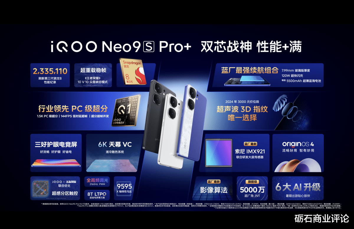 2024年7月11日,“双芯战神,性能+满”iQOO Neo9S Pro+于北京环球度假区正式发布,到手价2899元起。iQOO 在今年夏天为广大学生朋友带来性能、解锁、续航、外观和OS“全面+满”的暑期特别礼物—iQOO Neo9S Pro+,它拥有同级唯一[1]骁龙8 Gen3旗舰双芯和超声波3D指纹技术豪华配置组合,堪称同档性能旗舰不二之选。