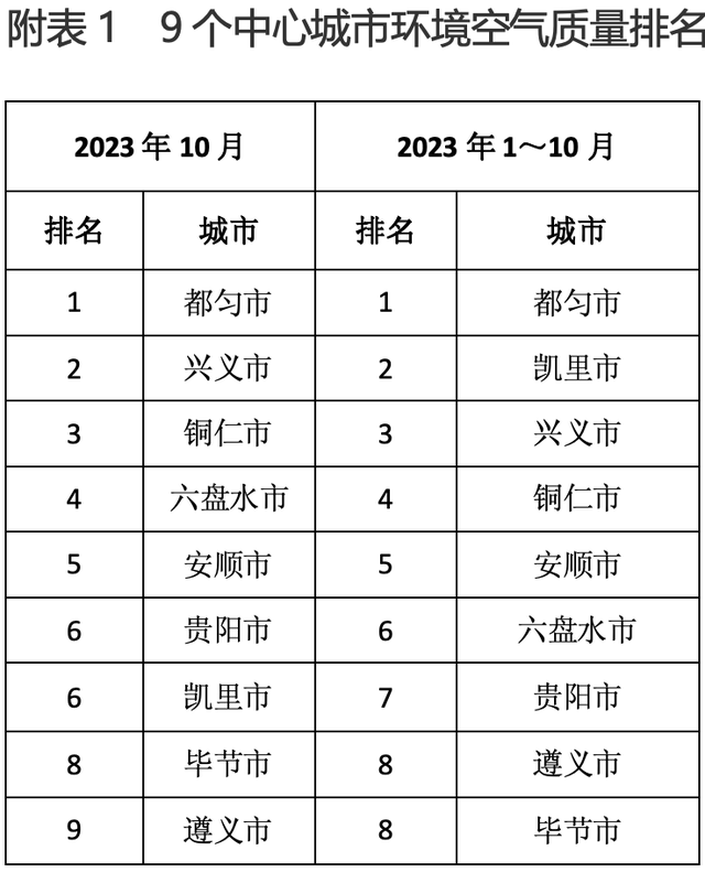 依据《城市环境空气质量排名技术规定》,按环境空气质量综合指数(简称综合指数)进行排序,2023年10月,9个中心城市环境空气质量由好到差依次为(含并列):都匀市、兴义市、铜仁市、六盘水市、安顺市、贵阳市、凯里市、毕节市、遵义市;2023年1~10月,9个中心城市环境空气质量由好到差依次为(含并列):都匀市、凯里市、兴义市、铜仁市、安顺市、六盘水市、贵阳市、遵义市、毕节市(见附表1)。
