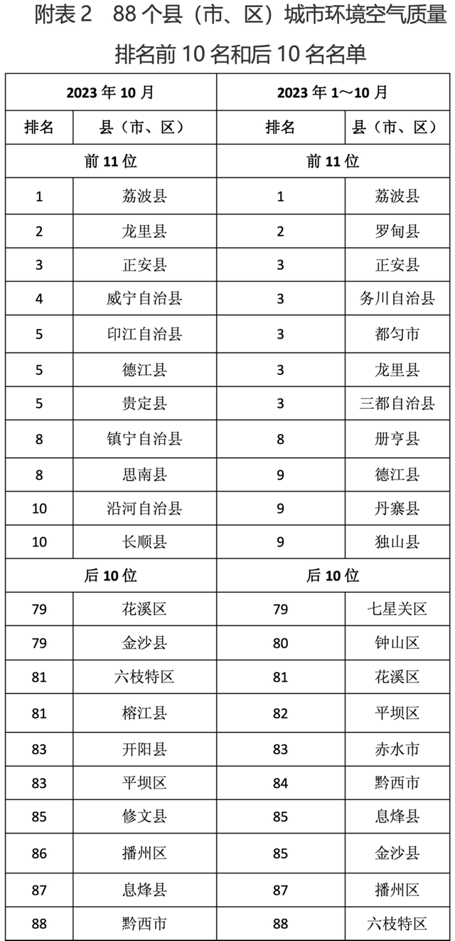 依据《城市环境空气质量排名技术规定》,按综合指数进行排序,2023年10月,88个县(市、区)城市环境空气质量相对较好的前11位(从第1名到第10名,含并列)为:荔波县、龙里县、正安县、威宁自治县、印江自治县、德江县、贵定县、镇宁自治县、思南县、沿河自治县、长顺县,城市环境空气质量相对较差的后10位(从第79名到第88名,含并列)为:花溪区、金沙县、六枝特区、榕江县、开阳县、平坝区、修文县、播州区、息烽县、黔西市;2023年1~10月,88个县(市、区)城市环境空气质量相对较好的前11位(从第1名到第9名,含并列)为:荔波县、罗甸县、正安县、务川自治县、都匀市、龙里县、三都自治县、册亨县、德江县、丹寨县、独山县,城市环境空气质量相对较差的后10位(从第79名到第88名,含并列)为:七星关区、钟山区、花溪区、平坝区、赤水市、黔西市、息烽县、金沙县、播州区、六枝特区(见附表2)。