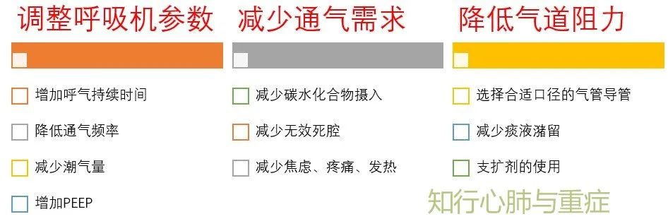 ⅰ)降低通气需求:如过度喂养和/或过量摄入碳水化合物会过度增加二氧化碳的产量。因此正确的营养支持将减少二氧化碳,从而促进通气。此外,缓解患者紧张情绪以及尽可能减少无效死腔也很重要。