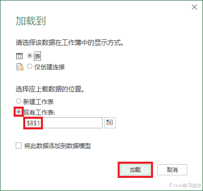 7. 在弹出的对话框中选择“表”--> 选择“现有工作表”及所需上传至的位置 --> 点击“加载”